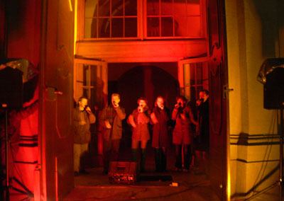 教会の鐘が7時を告げると、サンタクロースが登場。挨拶、そして今日の出演者の紹介を終えると教会の扉が開き、同時にミニコンサートが始まる。