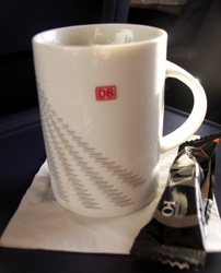 また、1等車専用に食事のサービスもあり、コーヒー、ビールなどのドリンクはもちろん、サンドイッチ、ソーセージ、スープ、朝食セット、スイーツのセットがある。カップ(写真右)のデザインがなかなかシンプルな洒落具合でドイツらしい。