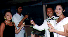 新郎新婦が窓側中央の席につくと、タキジートを着たウエイターがシャンペンのサービスを始め、新郎友人の司会で先ずは「乾杯!」、口々に「おめでとう!」の歓声と、新郎新婦に「腕を組んで」とか「グラスをあけろ」とかポーズづくりの注文が次々と飛ぶ。