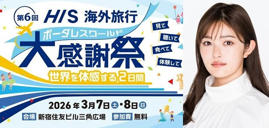 HISは2026年3月7日と8日の2日間、東京都新宿区にある新宿住友ビル三角広場において、世界を体感する2日間「第6回HIS海外旅行大感謝祭 ~ボーダレスワールド~」を開催する。これは海外旅行の魅力を五感で感し、その魅力を再認識することを目的としたイベントで、会期中は各方面の専門家によるスペシャルトークショーをはじめ、世界のスポーツやゲームを体験できるプログラムなどを展開。世界の名物料理が楽しめるフード出店もある。
